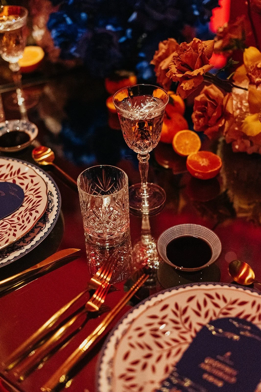 We replaced traditional runway seating with dining tables, so guests could continue to enjoy their scotch whisky cocktails while watching the show. We chose serpentine tables to give movement to the still life fashion show, and in order to properly view the runway, placed guests on only one side of the table, making plenty of room for the oversized and oversaturated floral centrepieces. Blue china plates, gold flatware, and sparkling crystal glassware created a glittering and elevated look. Menus were custom designed with Angel Chen artwork and letter-pressed with gold foil. We styled the table with citrus fruits, symbolizing good fortune. Working with Shangri-La Toronto’s in-house caterers, a multi-course tasting menu of bite-sized Chinese inspired foods was crafted, allowing the catering team to get super imaginative with how these traditional foods were presented. And of course, Johnnie Walker Blue Label whisky-inspired cocktails were served throughout the night!