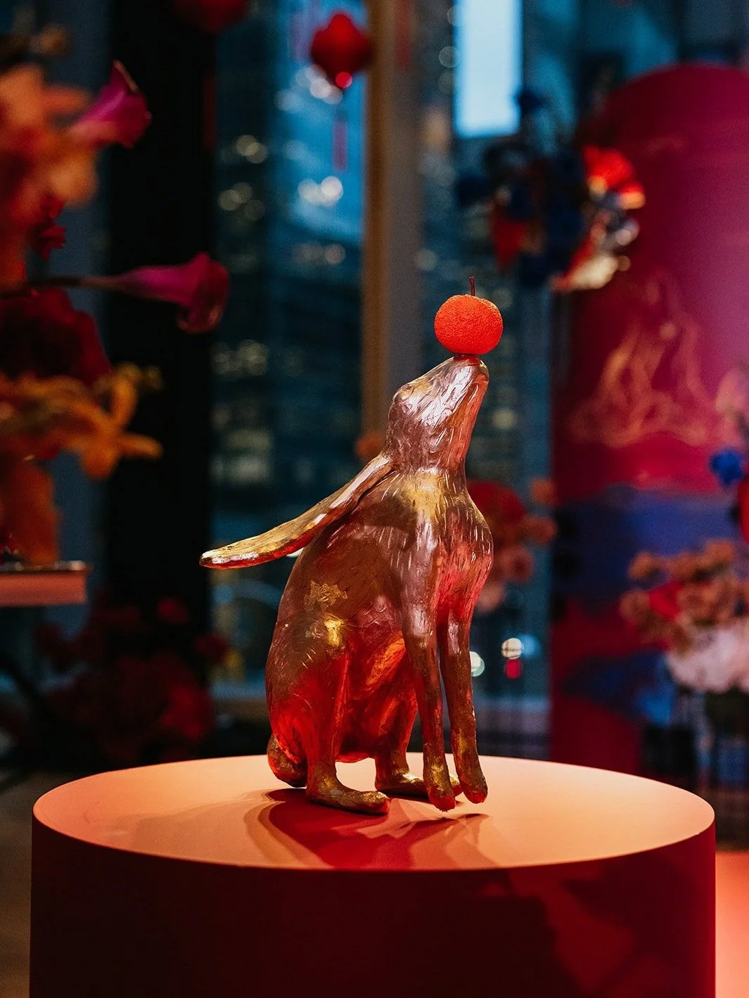 Inspired by the illustrations of leaping gold rabbits on the Angel Chen bottle designs, we fabricated these playful and expressive rabbit statues. Some held props like clementines, gift boxes and red envelopes to bring a storytelling aspect into the celebration- all traditional gifts presented on Lunar New Year. Their presence added a fantastical look to the evening, like being in a wild Lunar New Year garden.