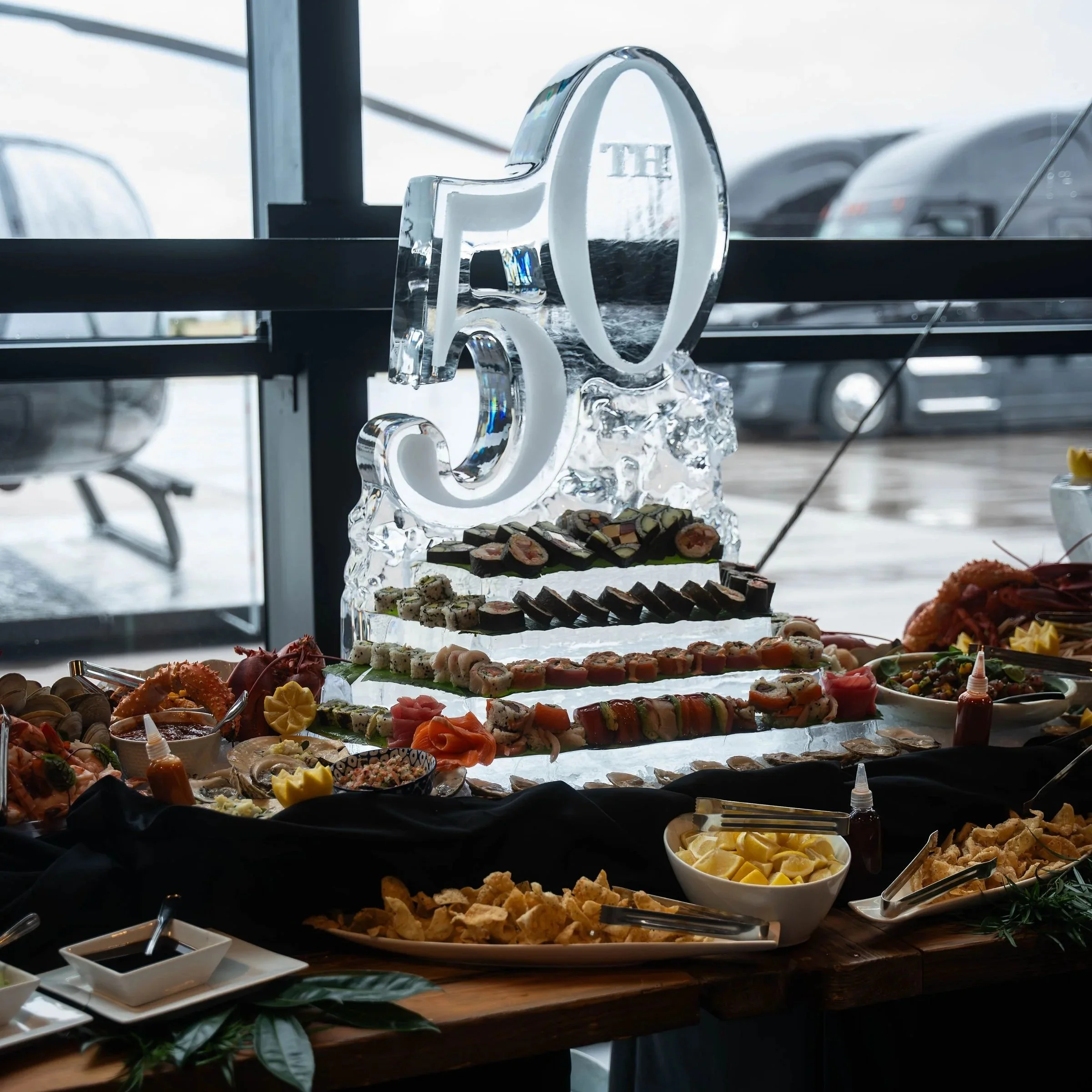 We were lucky - our client came to us with a trusted caterer already in mind - a family friend and restaurant owner based in Port Dover. We collaborated closely with the client and caterer to curate a menu that had it all - we’re talking 12' grazing tables, a carving station, wagyu, southern fried chicken, a rolling oyster cart, salad bar, mac 'n' cheese station, AND McDonald's! We also coordinated the catering rentals and added an attention grabbing ice sculpture that doubled as a sushi display, for an amazing statement piece that guests could actually eat from!